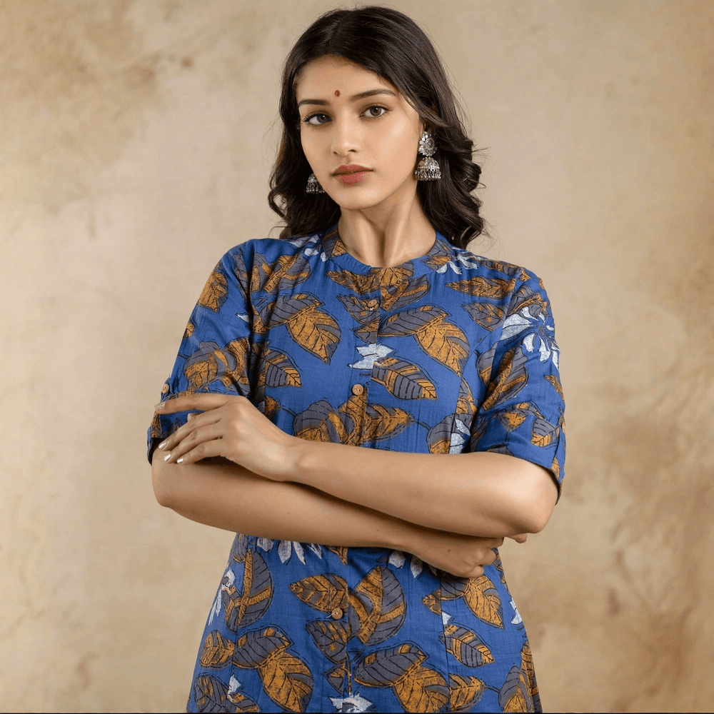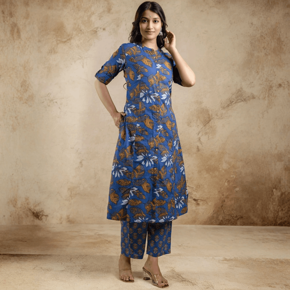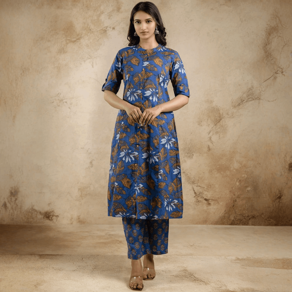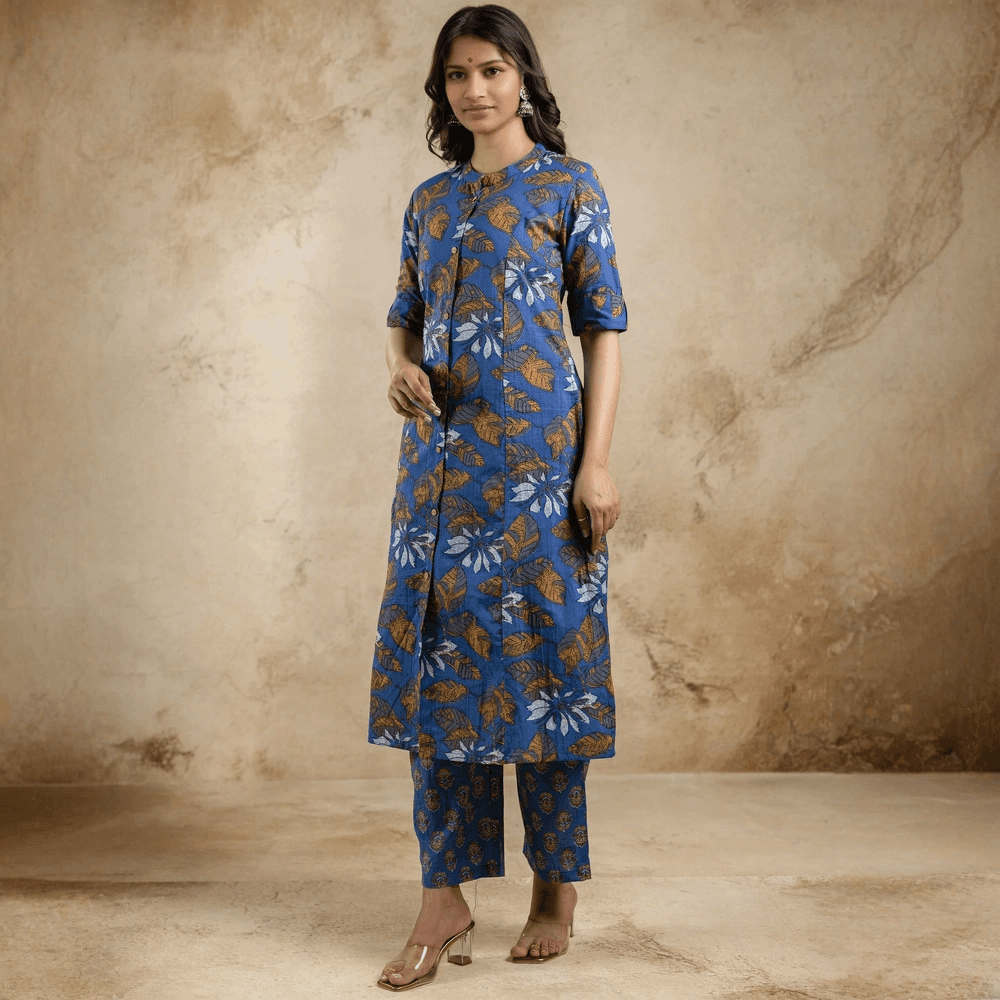 Blue Floral Printed A-line Cotton Co-ord Set