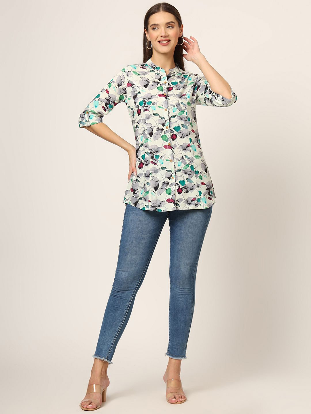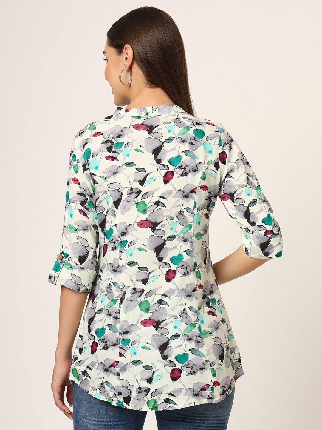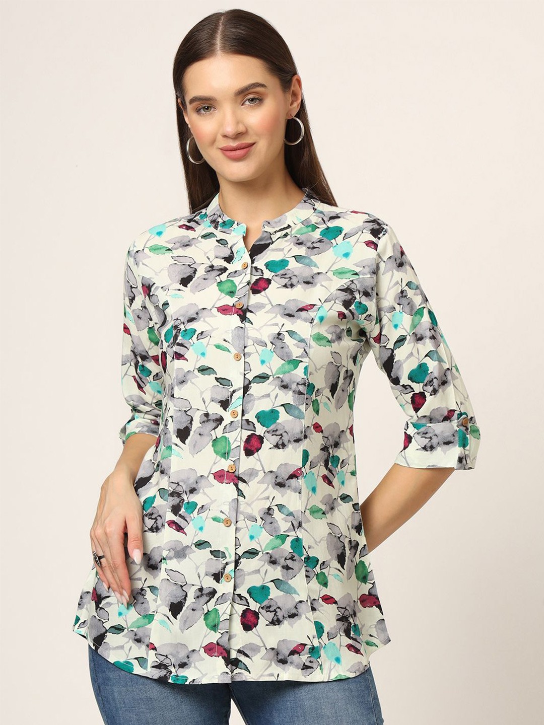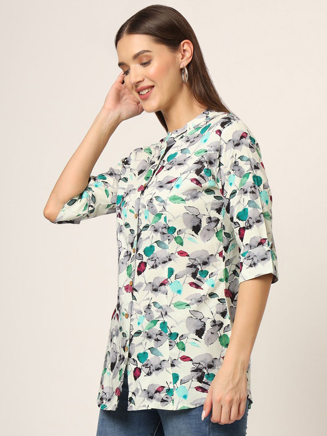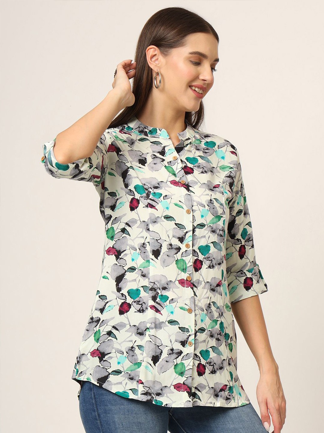 Women Multi colour Floral Print Mandarin Collar Roll Up Sleeves Shirt Style Top
