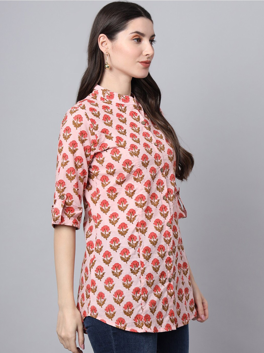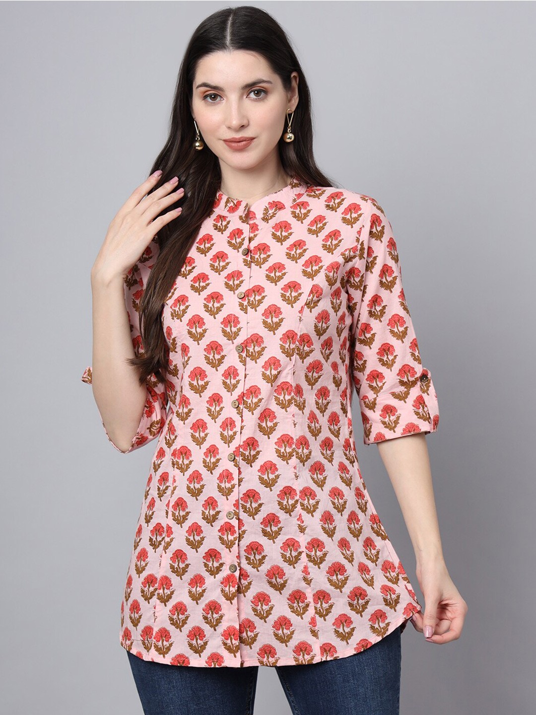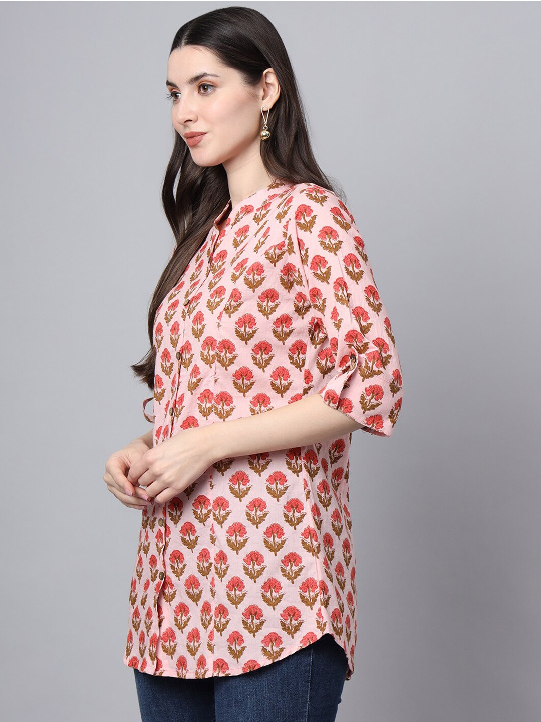 Pink Ethnic Motifs Print Mandarin Collar Cotton Shirt Style Longline Casual Top