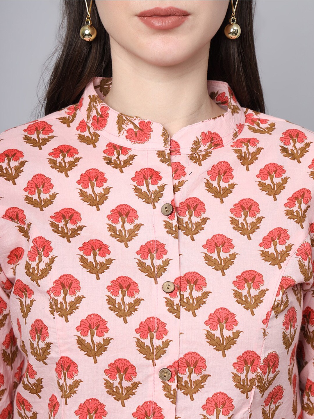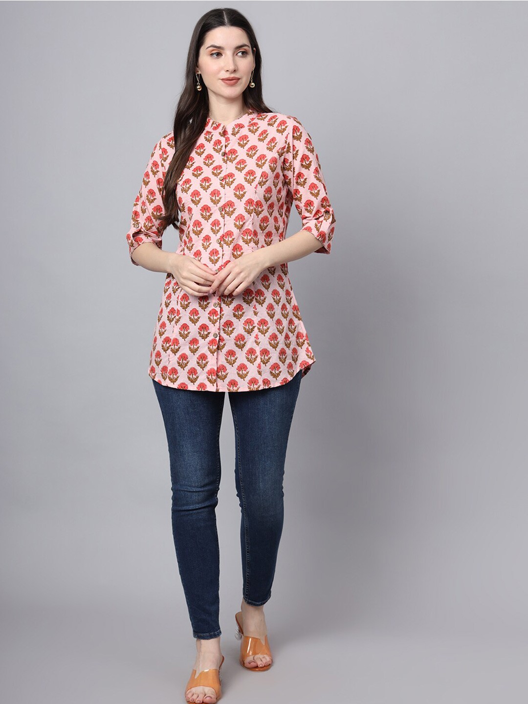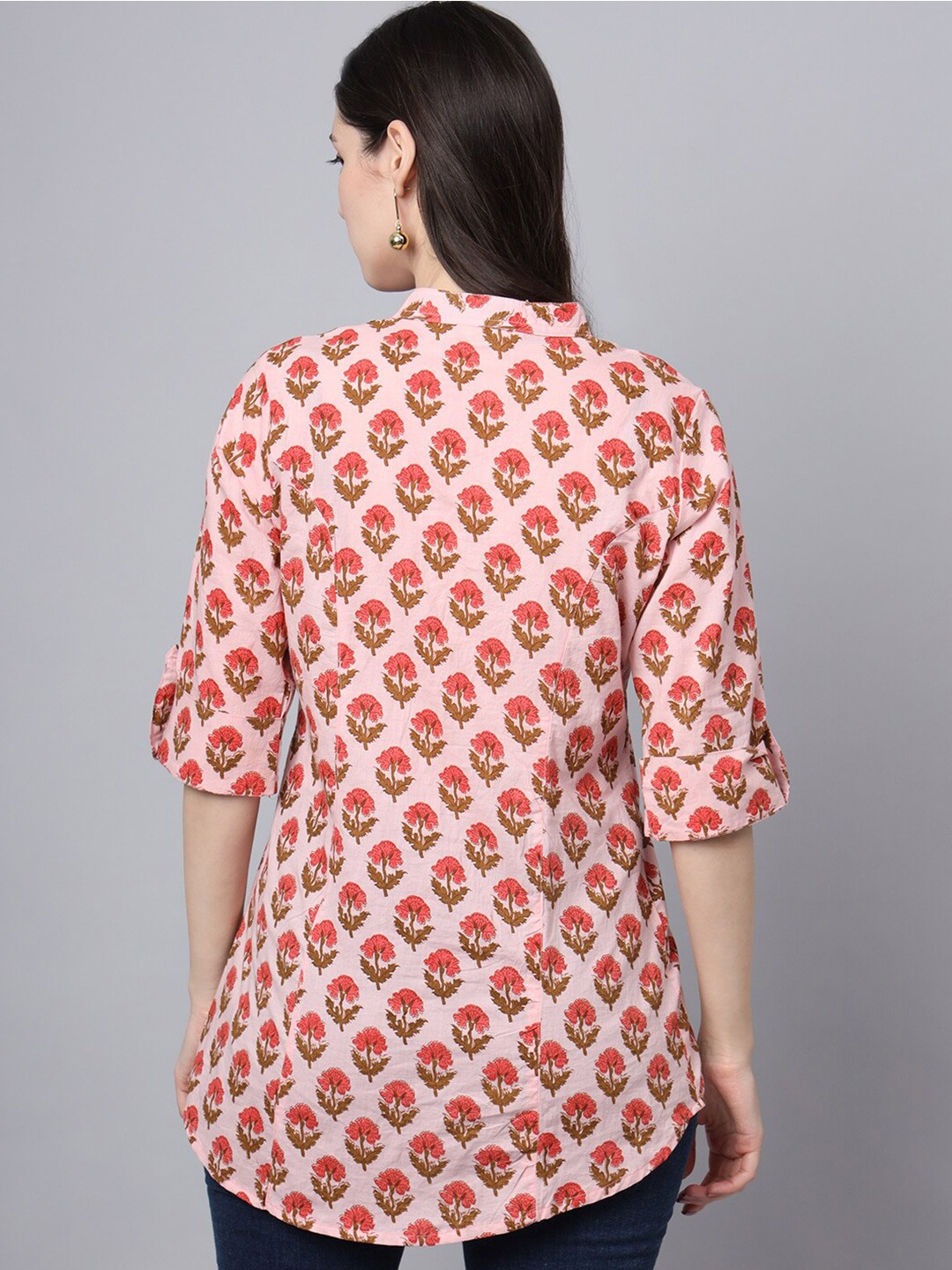 Pink Ethnic Motifs Print Mandarin Collar Cotton Shirt Style Longline Casual Top