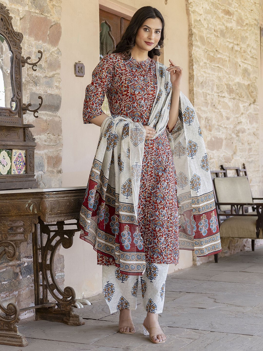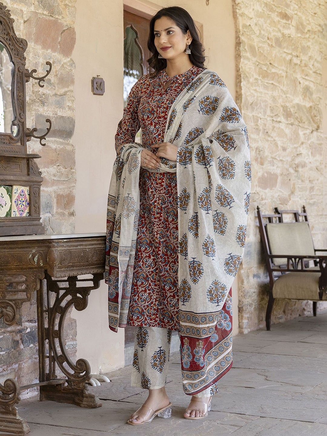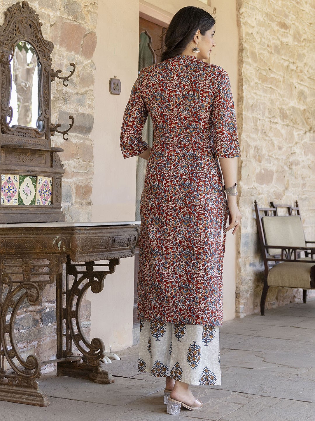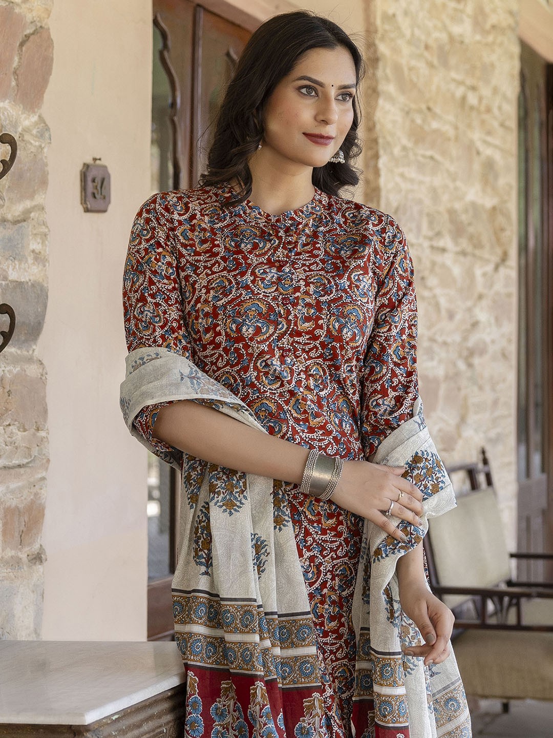 Maroon and cream-coloured printed kurta with palazzos and dupatta