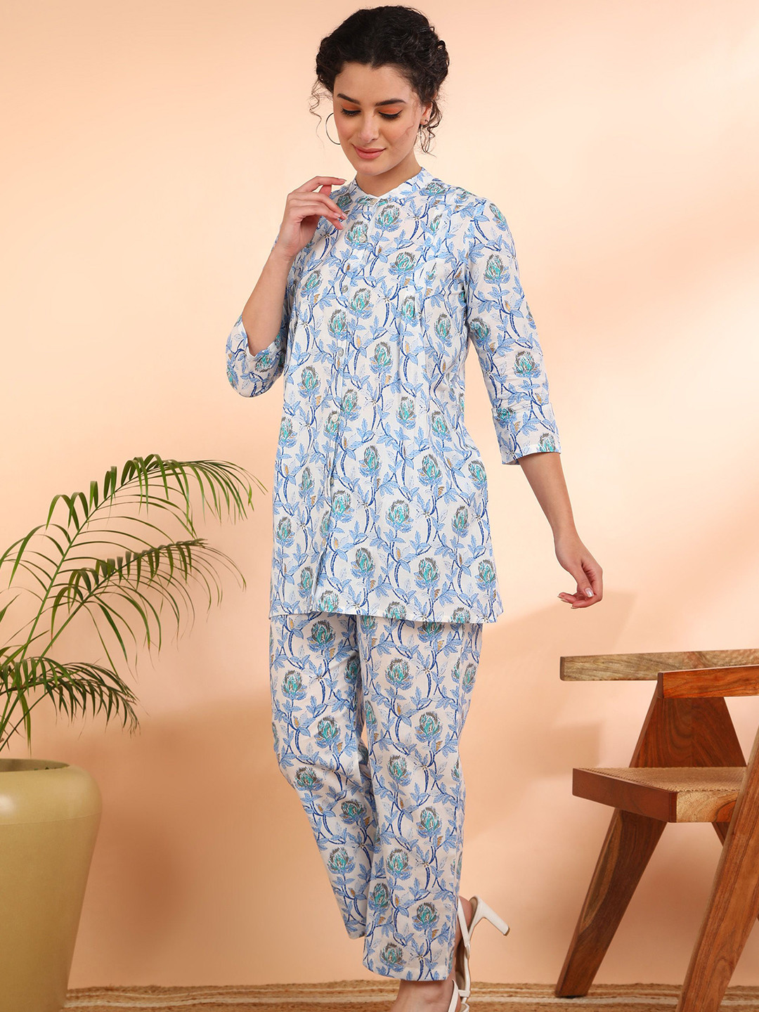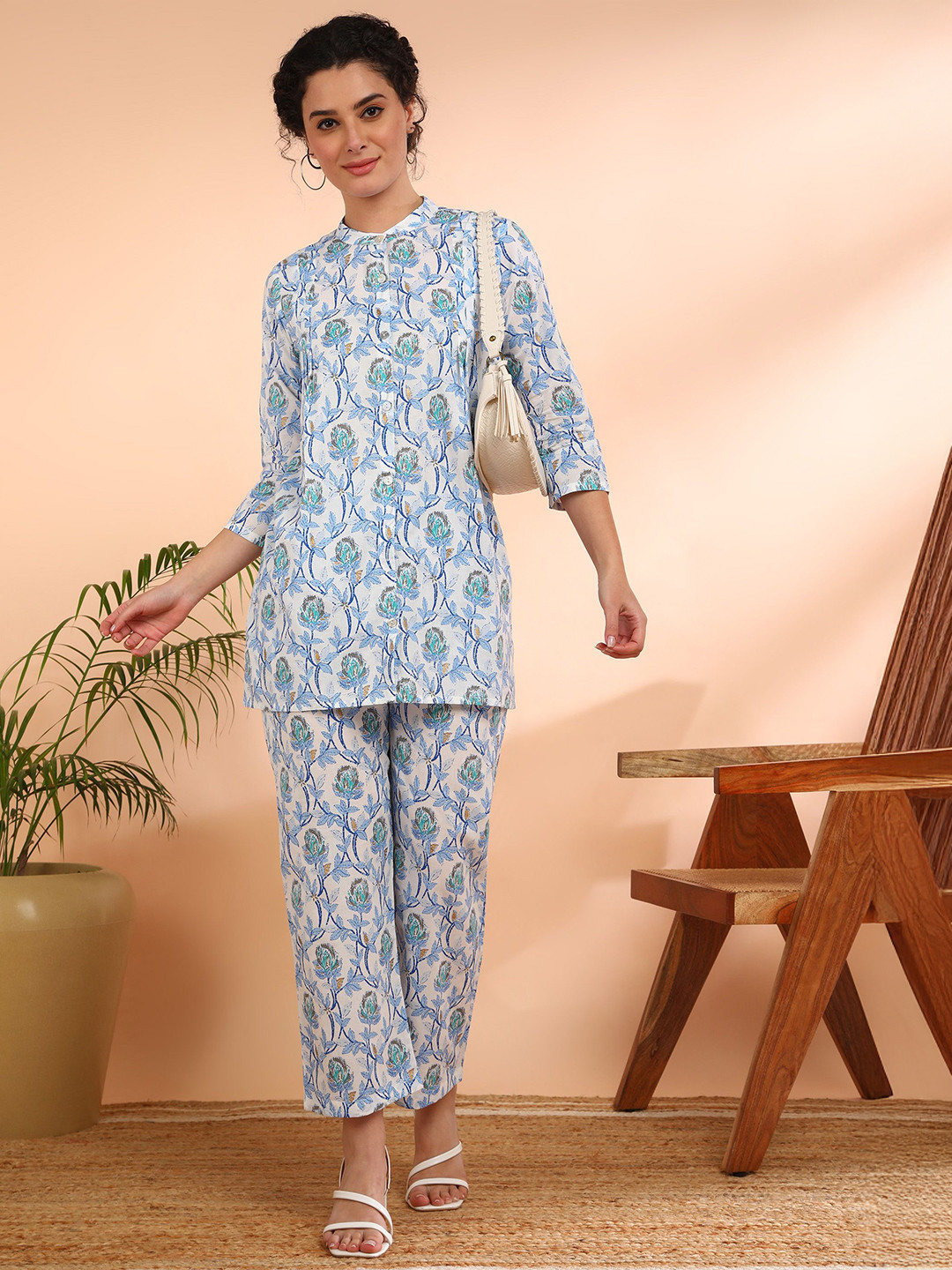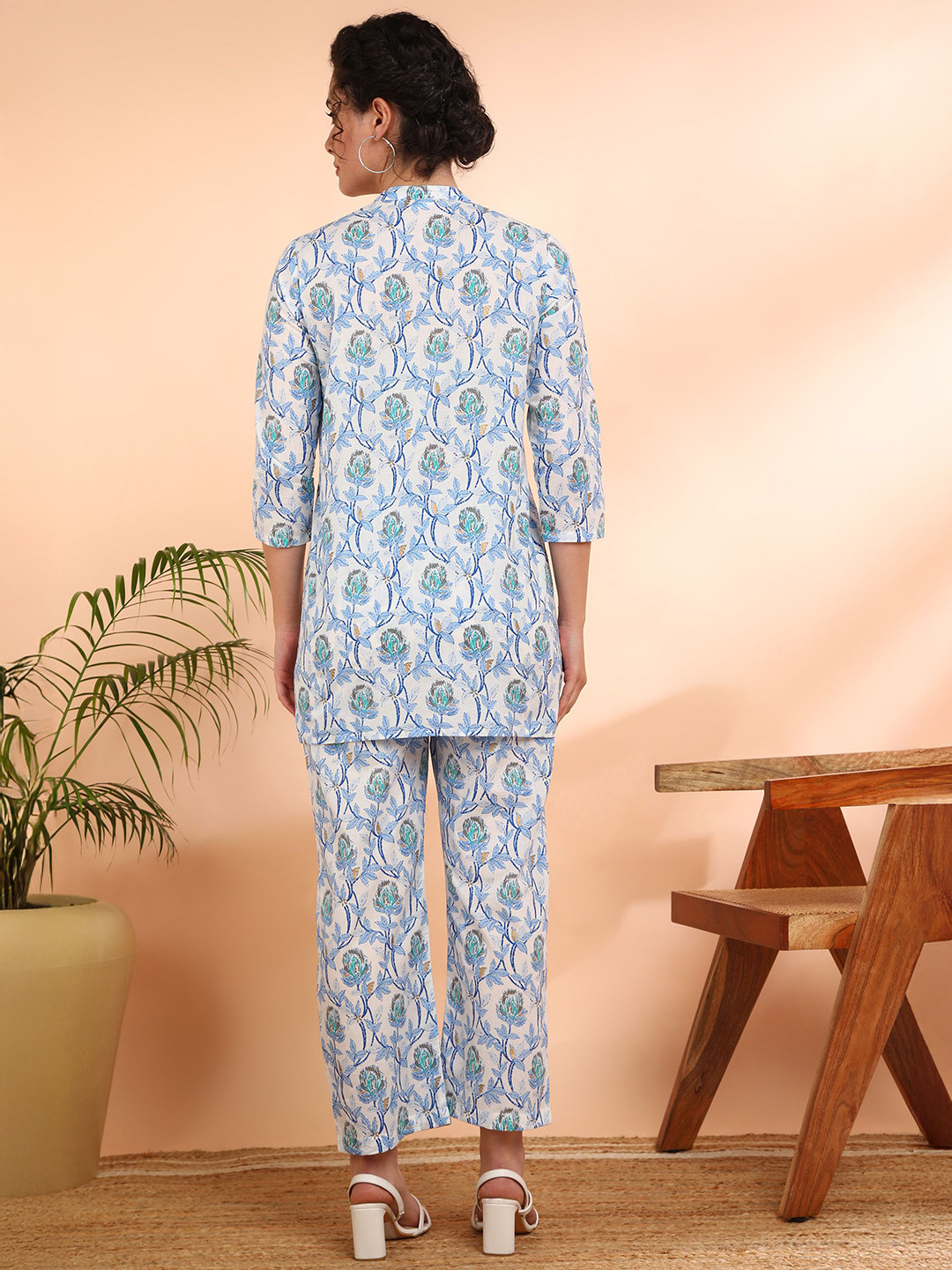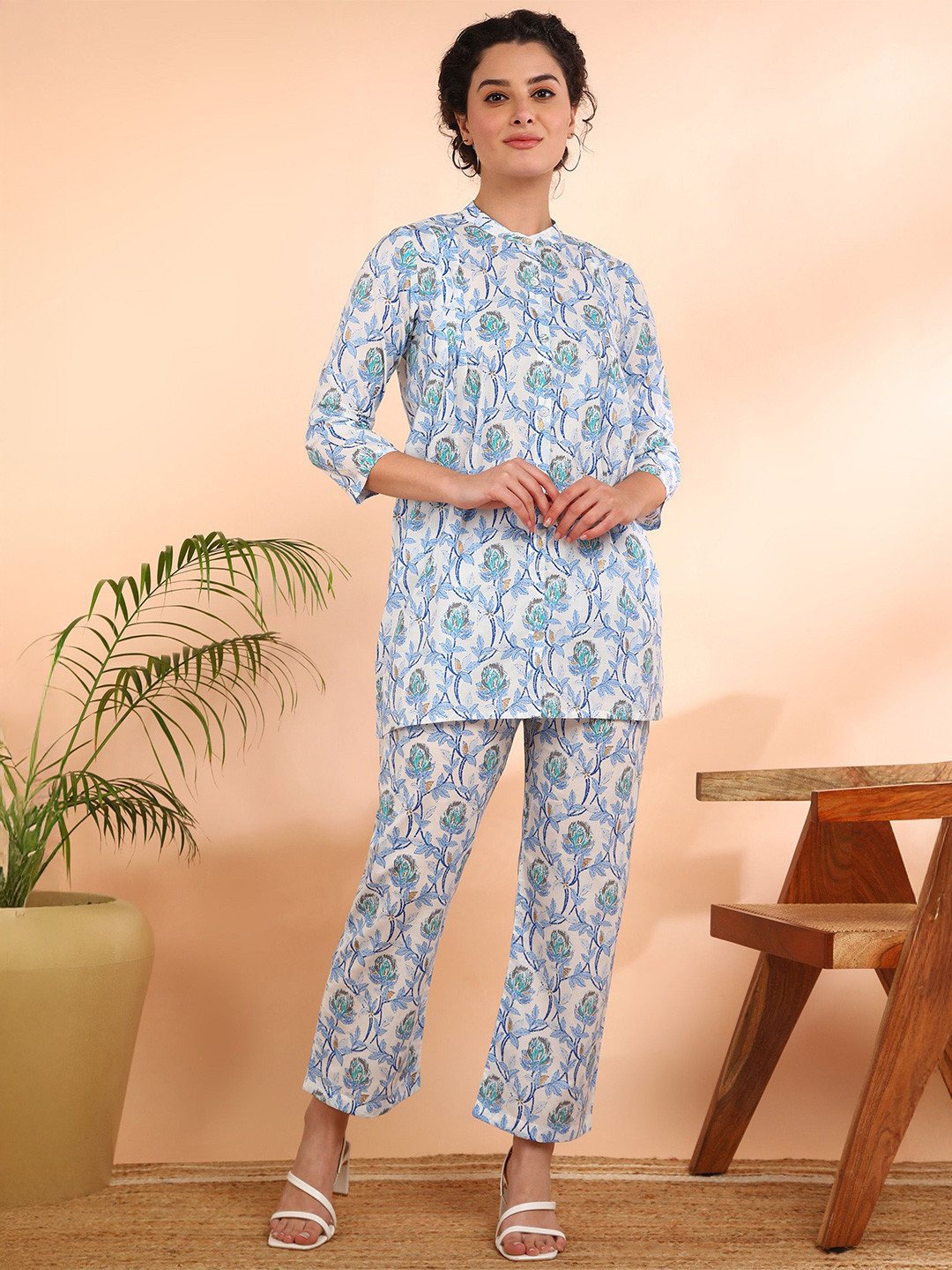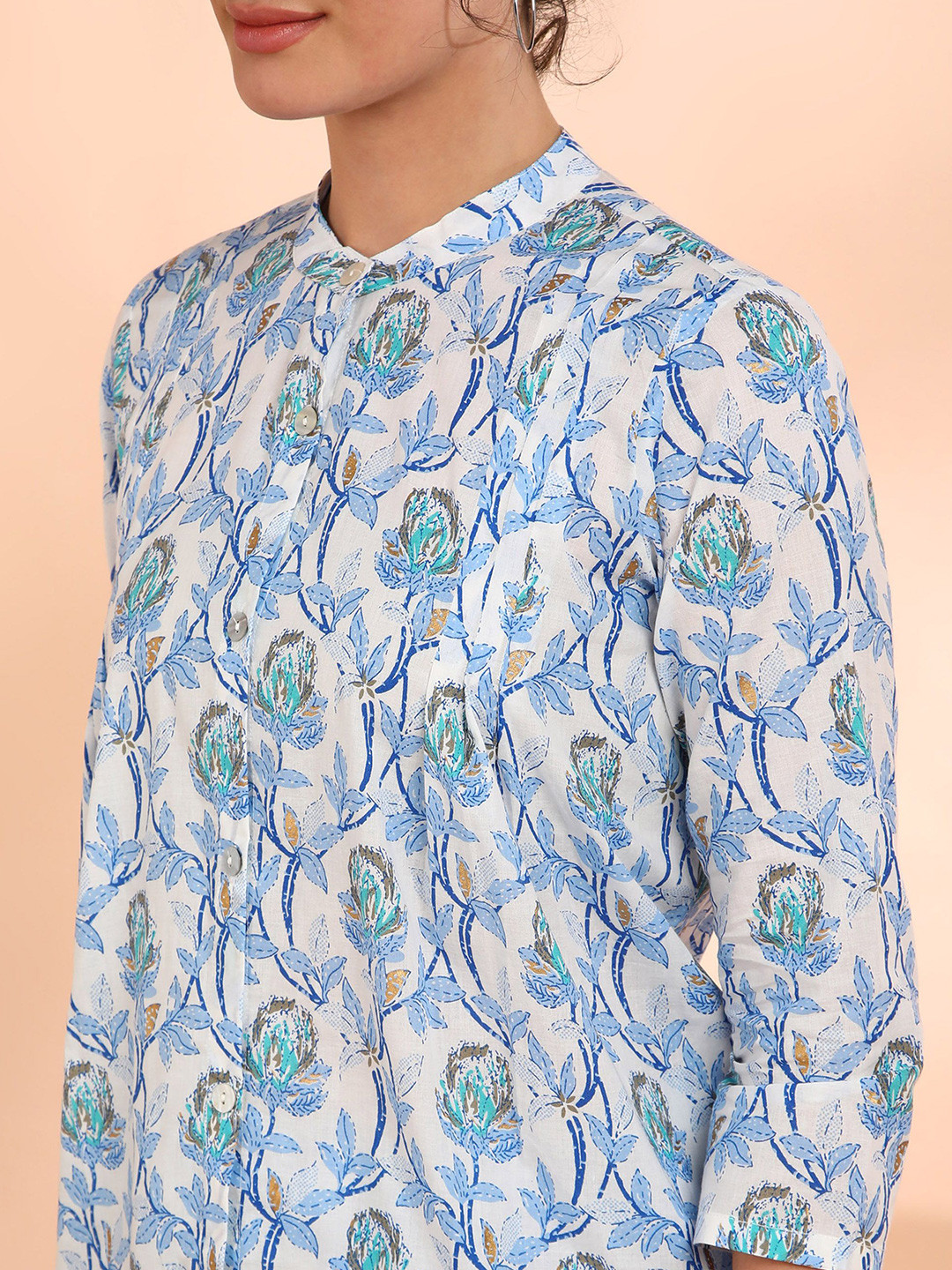 Blue and white printed shirt, has a mandarin collar and three quarter sleeves, secured with button closure