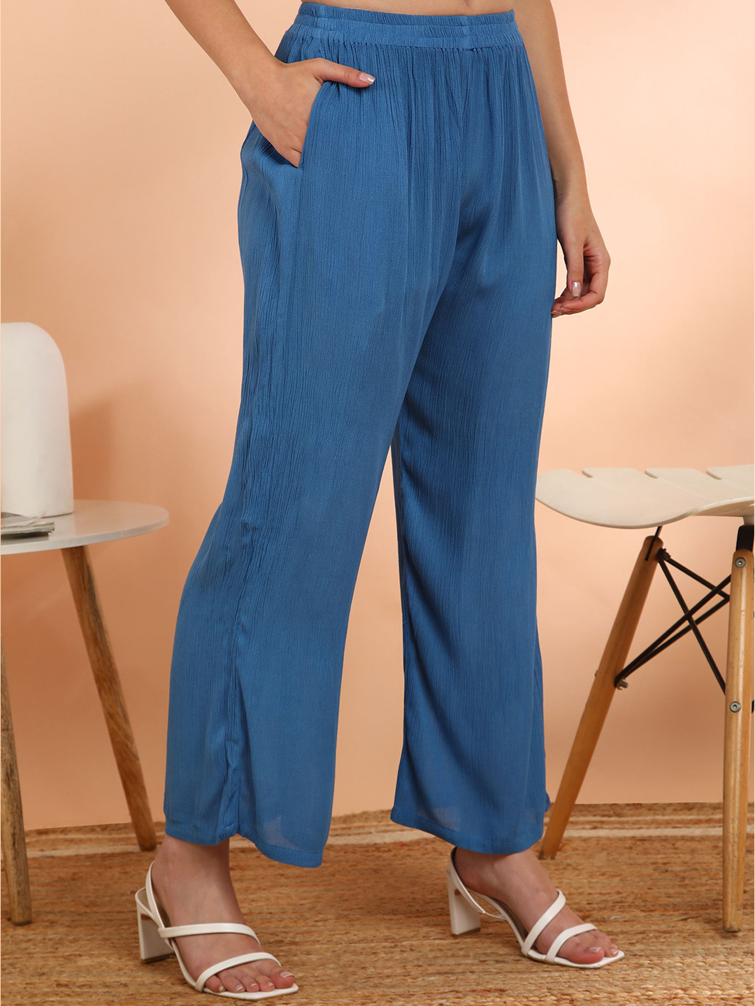 Blue solid palazzos, has an elasticated waistband with slip-on closure has 2 pockets