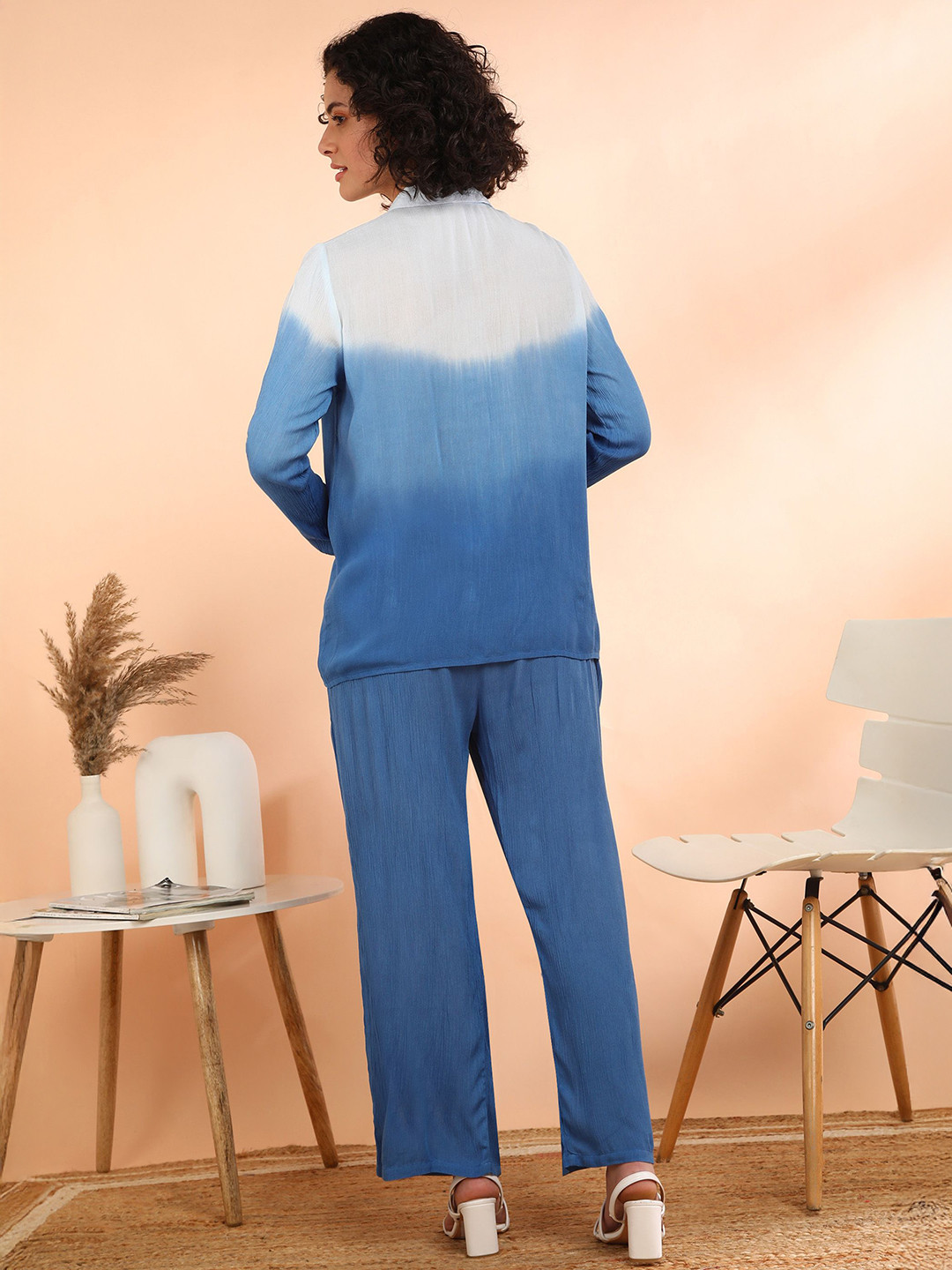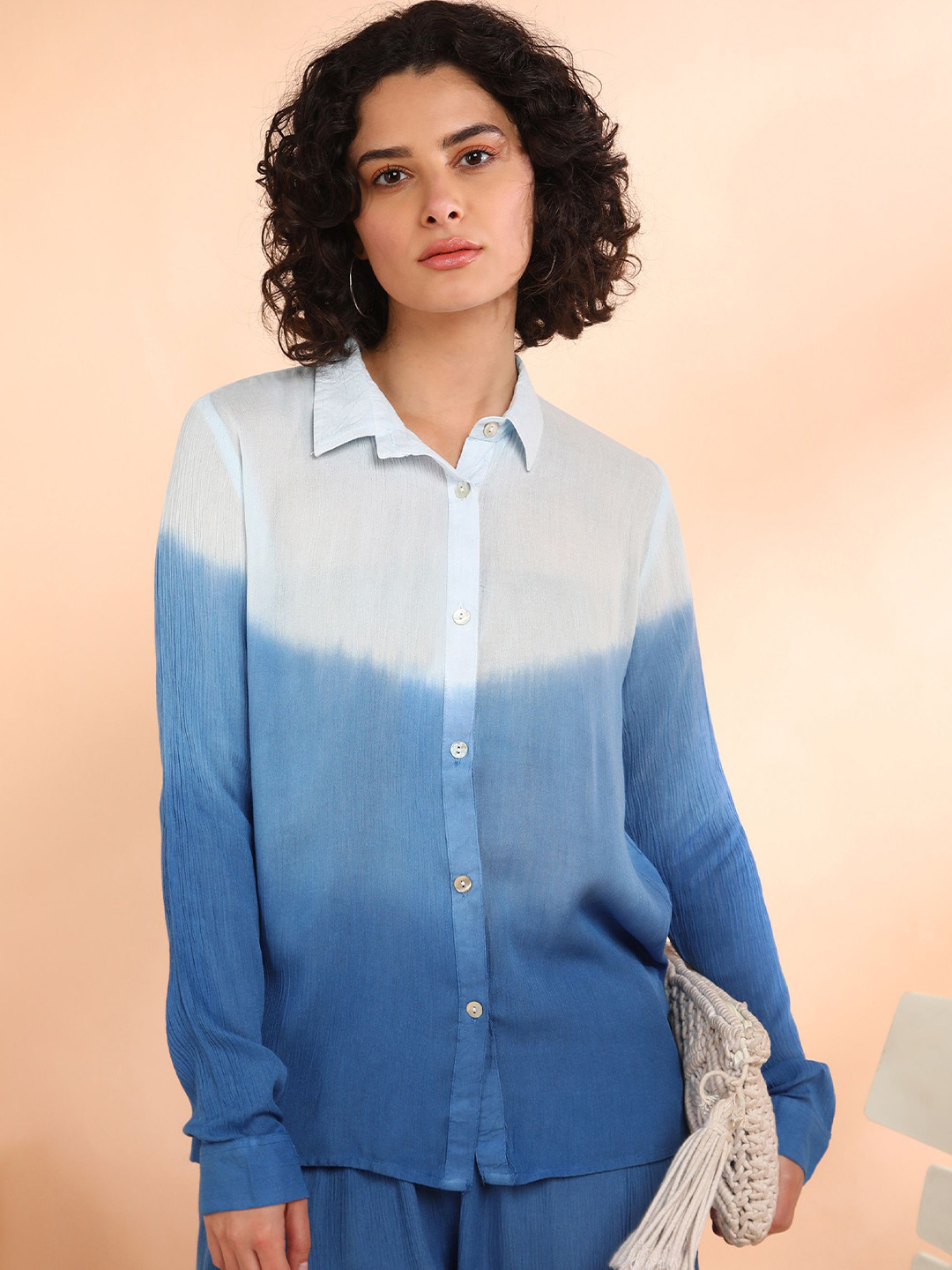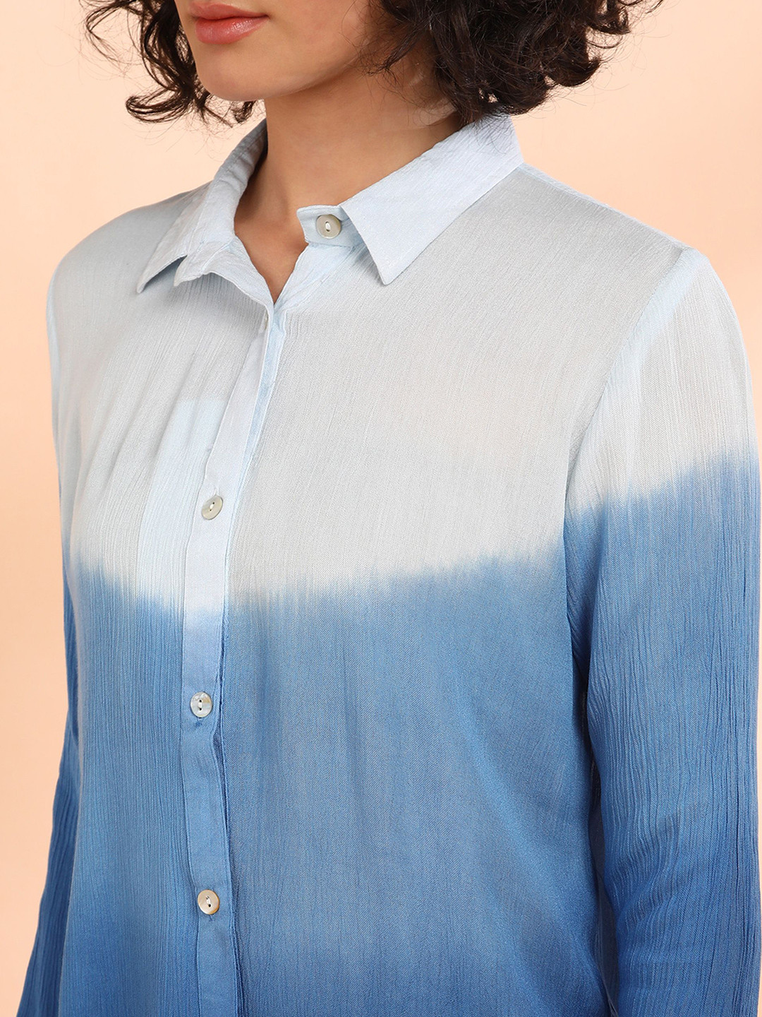 Blue and white dyed shirt, has a shirt collar and long sleeves, secured with button closure