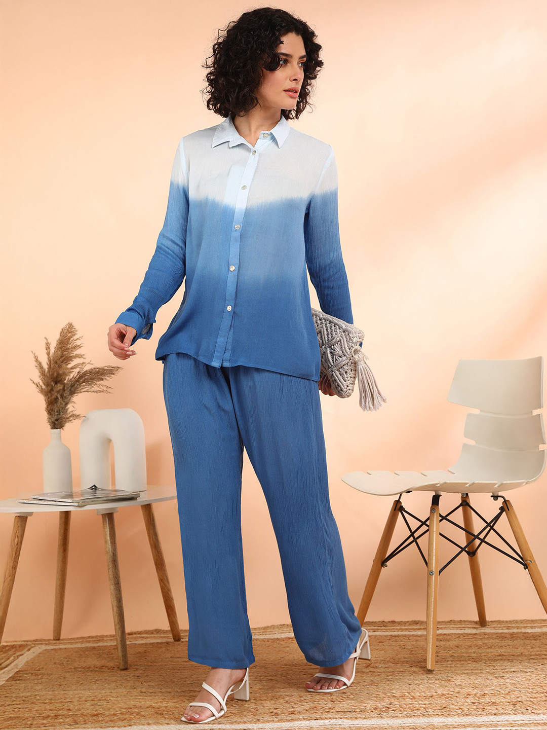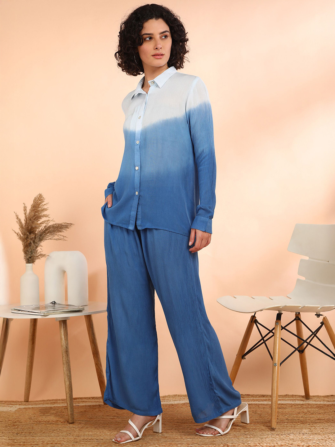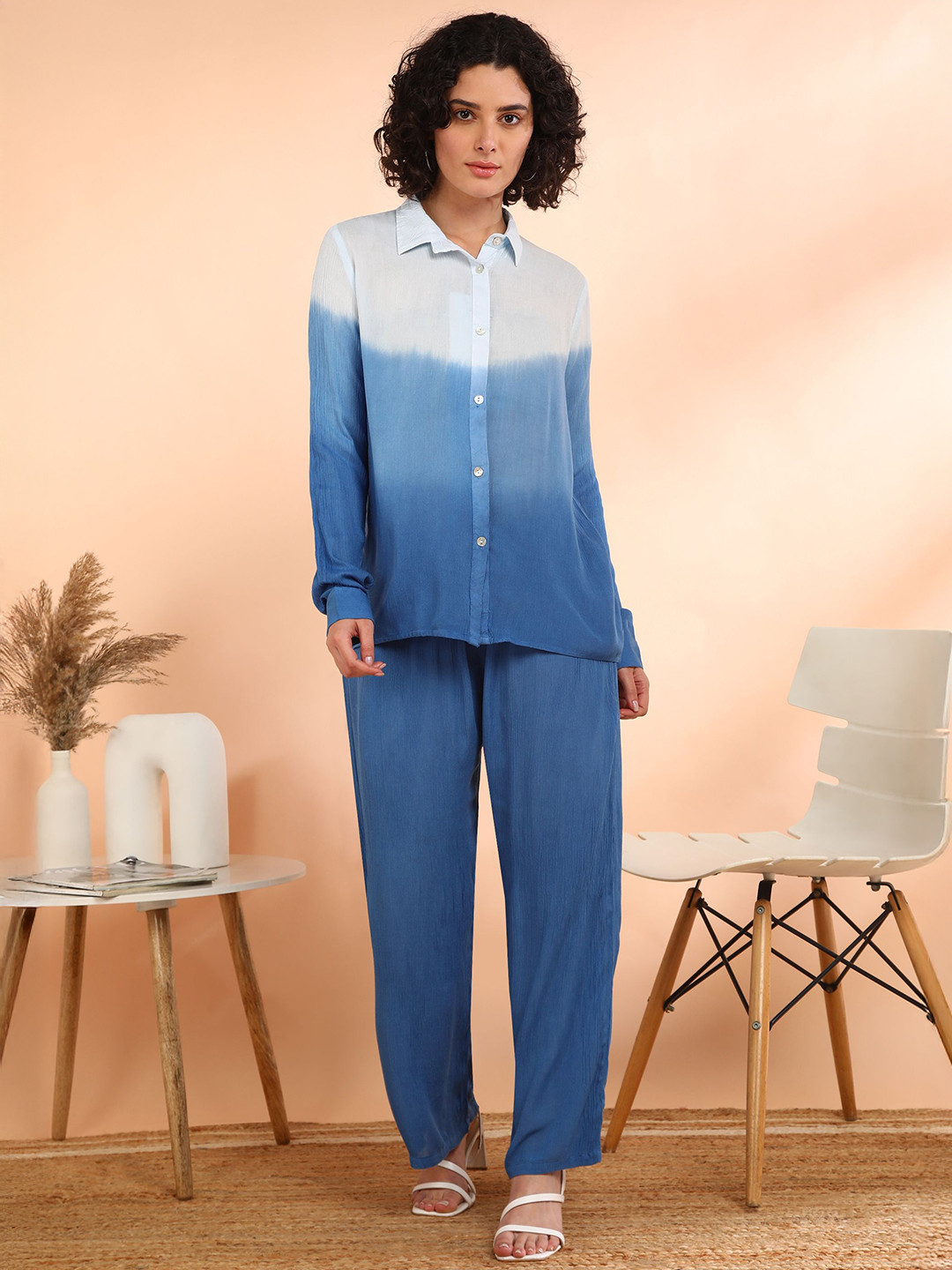 Blue and white dyed shirt, has a shirt collar and long sleeves, secured with button closure